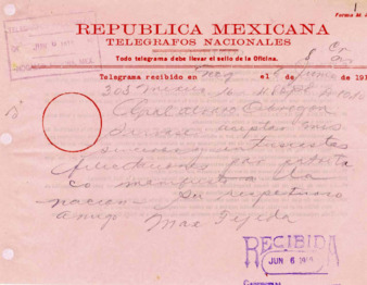 Telegrama del Sr. Max Tejeda al Gral. Alvaro Obregón felicitándolo por su MANIFIESTO A LA NACION.