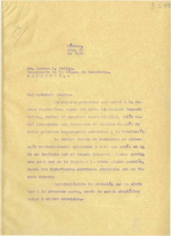 Correspondencia entre el Gral. Alvaro Obregón y el Sr. Carlos B. Zetina, Presidente de la Cámara de Senadores, relativa a la solicitud de una pensión para la Sra. Flavia Sosa Vda. de Toledo. Exp. S-34
