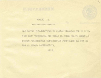 Cartas fotográficas de cartas que el Dip. Luis Torregrosa envía a "Xpilin" Felipe Carrillo Puerto, planteando la necesidad de que la diputación de Yucatán se una al bloque cooperatista del Licenciado Jorge Prieto Laurens.