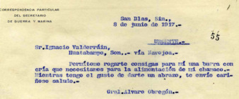 Telegrama urgente del Gral. Alvaro Obregón a Ignacio Velderrain solicitándole consiga una burra con cría para que alimente a su "chamaco". (El apellido es Velderrain aún cuando el telegrafista haya transcrito Valderrain).