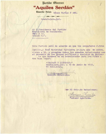 Rosalío Ruvalcaba y Mariano Aguilera del Partido Obrero Aquiles Serdán, informan al Presidente del Partido Socialista de Occidente que han nombrado a los señores J. Cruz Murillo y José Natividad Valtierra para que se entrevisten con él y arreglen los asuntos relacionados con los clubes políticos de Jalisco. El Dip. Joaquín Vidrio y Julio García del Partido Socialista Antirreeleccionista de Occidente informan al General Carlos A. Vidal, Presidente del Comité Pro-Serrano, estar enviándole el recibo y el informe de corte de caja por los quinientos pesos que recibieron para gastos de campaña. Recibo, corte de caja y respuesta de General Arturo Lazo de la Vega, Secretario General del Comité Pro-Serrano, informando haber recibido la documentación anterior.