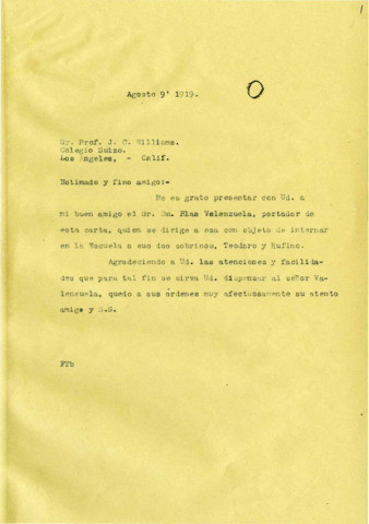 Correspondencia entre el Prof. C.J. Williams, Director del Williams International School de Los Angeles, Cal., E.U.A. y el Gral. Alvaro Obregón, en la que el Gral. Obregón recomienda al Sr. Blas Valenzuela, quien desea internar en la escuela a dos de sus sobrinos. Respuesta indicando que han sido aceptados y expresándole su simpatía y adhesión a su candidatura; asimismo, elogia a su sobrino Lamberto y a su hijo Humberto. El Gral. Obregón agradece las expresiones de afecto hacia su hijo y su sobrino. Asunto relacionado con la ampliación del Williams International School y la solicitud al Gral. Obregón para que se convierta en su socio. El Gral. Alvaro Obregón solicita al Director del Colegio Williams que le otorgue un permiso a su sobrino Lamberto para que emprenda un viaje. El Gral. Obregón comunica que su hijo Humberto debe apegarse a los reglamentos establecidos por el colegio y le agradece al Prof. C.J. Williams las atenciones que tiene para él.