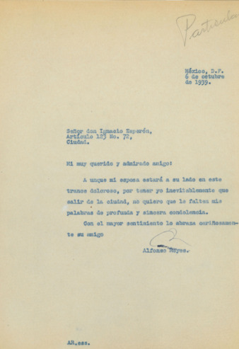 Carta de Alfonso Reyes, dirigida a Ignacio Esperón, en la que envía palabras de condolencias.