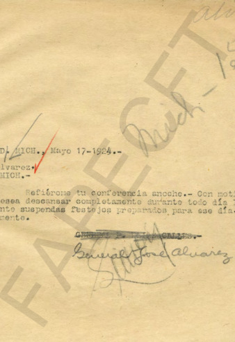 Telegrama de Rafael Alvarez al Gral. PEC en el cual manifiesta su adhesión. Telegrama del Gral. José Alvarez al Sr. Rafael Alvarez en el cual le pide que suspenda los festejos ya que el Gral. PEC quiere descansar.