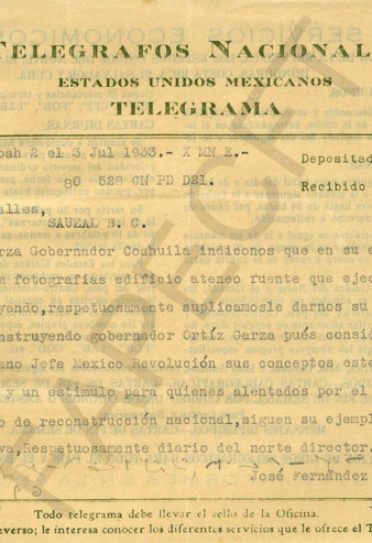 Dos telegramas entre José Fernández Rojas y el Gral. PEC sobre la construcción del Ateneo Fuente en Coahuila, por el Gobernador Ortiz Garza.