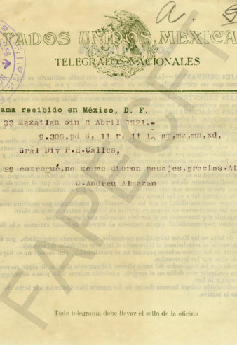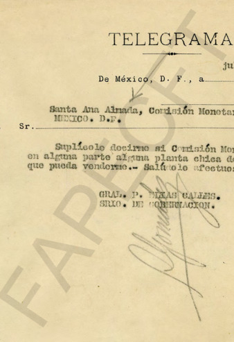 Correspondencia entre el Ing. Santa Ana Almada, Gerente de la Comisión Monetaria y el Gral. PEC. El Ing. Almada le adjunta telegramas relativos al asunto tratado con A. Celis. Telegrama del Gral. PEC al Ing. Almada en el que le envía condolencias por la muerte de su padre. Carta del Ing. Almada al Gral. PEC en la que recomienda al Sr. Luis G. Alarcón, quien desea postularse como candidato a Diputado por Tlaxcala. Recibo por mil pesos, contribución del Ing. Santa Ana Almada para la campaña electoral del Gral. PEC. Fotografía de una procesión de Semana Santa en Navolato, Sin. (véase en Fototeca).