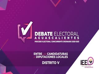 Partidos políticos que participan en el debate: Partido del Trabajo -- Partido Verde Ecologista de México -- Movimiento Ciudadano -- Morena -- Coalición PAN-PRD -- Nueva Alianza Aguascalientes. | Participantes del debate: Consejero presidente: Maestro Luis Fernando Landeros Ortiz. -- Moderadora: Clara Beatriz Jiménez. -- Candidatos: Michelle López Velazco, Daniela Malinaly Márquez Salto, Víctoria de los Ángeles Topete Mier, Susana Sofia Calderón Pulido, Nancy Xóchitl Macías Pacheco, María del Carmen Mayela Macías Alvarado.