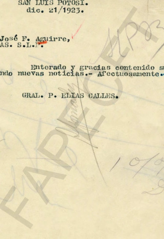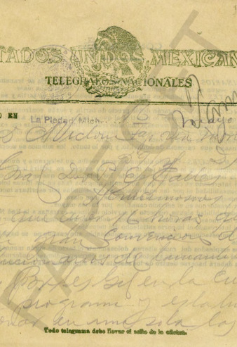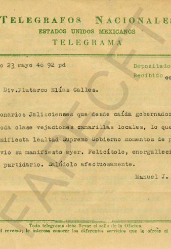 Telegrama de Fructuoso Aguirre, Presidente del Comité Ejecutivo del Partido Agrarista Jalisciense y Coalición de Partidos Renovadores de Occidente, del Partido Nacional Revolucionario, al Gral. PEC. Acuerdan postular a la gubernatura para el estado de Jalisco al Dr. Pedro Rodríguez y piden se acabe con los elementos fanáticos que pretendan alterar el orden.