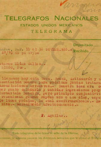 Correspondencia de R. E. Aguilar al Gral. PEC. Desea se encuentre mejor de salud; solicita trabajo en el consulado de los Estados Unidos. Le ruega lo recomiende con el Ing. Alberto J. Pani. Telegrama de Emilio Aguilar solicitando ayuda para no ser removido de su puesto.
