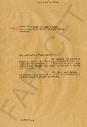 El Gral. PEC presenta ante el Lic. José Aguilar y Maya, Procurador General de la República, al Lic. Valente Arellano. Respuesta del Lic. Aguilar y Maya comunicando algunos aspectos que hacen inconveniente su ingreso al Ministerio Público Federal. El Lic. Aguilar y Maya informa al Gral. PEC de la detención del sacerdote José Jiménez, relacionado con el asesinato del Gral. Alvaro Obregón.