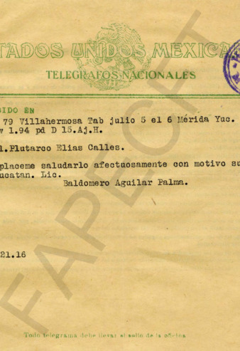 El Lic. Baldomero Aguilar Palma saluda al Gral. PEC con motivo de "su feliz llegada a Yucatán".