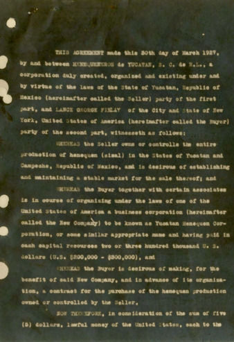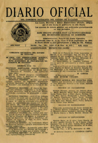 Ejemplar del Diario Oficial del Gobierno Socialista del Estado de Yucatán, del 27 de noviembre de 1933. Carta de Felipe G. Cantón al Gral. PEC, Secretario de Hacienda y Crédito Público, relativa al problema agrario de Yucatán. Le pide reitere el cumplimiento del oficio que envió la Comisión Nacional Agraria a su agencia de Yucatán para que se resiembren los terrenos afectados por el reparto agrario. Carta de M. Díaz Cossío a Soledad González, secretaria particular del Gral. PEC. Le anexa un informe relativo a un procedimiento para suavizar el henequén y otras fibras similares. Carta de Martín Díaz de Cossío al Gral. PEC. Le envía una carta que dirige a Agustín Rodríguez, Director del Banco de México, relativa a la venta de henequén a Rusia. Carta del Ing. E. Casares y el Lic. G. Molina Font al Gral. PEC. Le anexan un folleto relativo al problema agrario en Yucatán. Ejemplar del Informe General del Comité Directivo y del Gerente Ejecutor de la Sociedad de Henequeneros de Yucatán Cooperativa Limitada del año de 1931. Trata de los problemas de la producción y comercialización del henequén en Yucatán. Telegrama de Guillermo Salorio, Representante Federal, ante los henequeneros de Yucatán al Gral. PEC. Solicita audiencia. Telegrama de Arturo Ponce Cámara al Gral. PEC, relativo al plan del Banco de México para restringir la producción de henequén por falta de demanda. Telegrama de Guillermo Salorio al Gral. PEC, sobre las gestiones del Gobierno del Estado para que se decrete un paro en el trabajo de las haciendas henequeneras para lograr la disminución de la producción de la fibra. Carta de Guillermo Salorio al Gral. PEC. Le comunica que ha presentado su renuncia al puesto de Representante Federal ante los Henequeneros de Yucatán C. L. al Lic. Abelardo Rodríguez. Carta de Ramiro Bojorquez al Gral. PEC. Le envía un estudio sobre las crisis recurrentes del henequén.