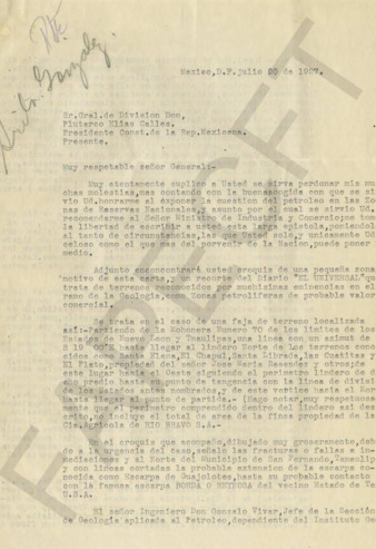 Carta del Ing. Manuel M. Heredia al Gral. PEC. Le informa sobre el estudio geológico que ha hecho en el estado de Tamaulipas, habiendo encontrado zonas petrolíferas de probable valor comercial. Anexa un croquis.