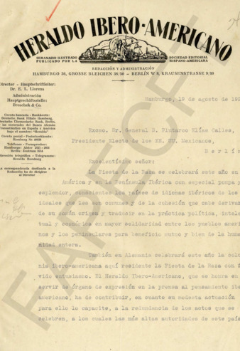 Carta de E. L. Moreno, Director de el HERALDO IBEROAMERICANO, al Gral. PEC, Presidente de México, relativa a la celebración del Día de la Raza para lo que el periódico se propone publicar un número especial dedicado a los Jefes de Estado de los países iberoamericanos. Le pide que envíe una foto y unas palabras para esta publicación.