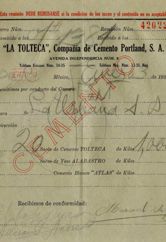 Recibos, pedidos, facturas y notas de materiales de construcción para las casas del Gral. PEC en la Hacienda Santa Bárbara.