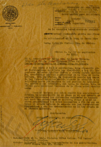 Oficio firmado por el Ing. Aurelio Leal Treviño dirigido al Administrador de la Hacienda Santa Bárbara. Le comunica que se nombro la comisión que va a efectuar una inspección previa cuyo fin es la colonización de los terrenos de la finca.