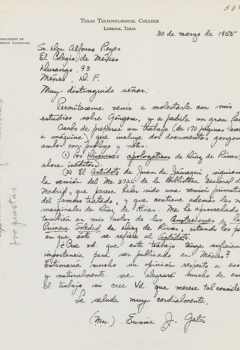 Correspondencia entre José Erico Gordón, y Alfonso Reyes, presidente de El Colegio de México, relativa a la solicitud de ayuda para Erico Gordón a su ingreso a México desde Brasil.