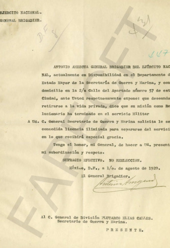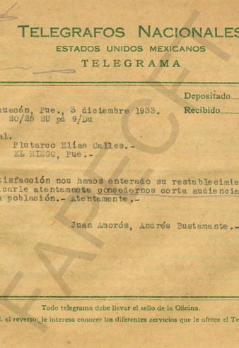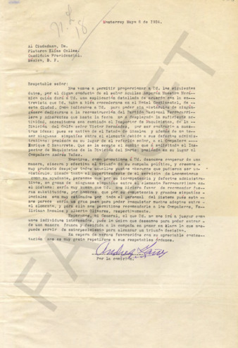 Andrés Yáñez, miembro de la comisión de reconstrucción del Partido Nacional Ferrocarrilero, propone al Gral. PEC la destitución de algunos empleados ferrocarrileros. Carta de adhesión al Gral. PEC, con motivo de su candidatura presidencial, firmada por A. Amparán, empleado ferrocarrilero y representante de ese sector en la campaña Pro-Calles en Monterrey. Solicitud para que Manuel M. García sea reinstalado como maquinista de la División de Ferrocarriles en Monterrey.