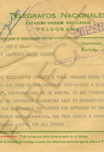Aviso del Gobernador Interino de Sinaloa, Antonio Amézquita, al Gral. PEC sobre la posesión provisional de ejidatarios de las tierras de temporal "La Capilla", en El Fuerte.