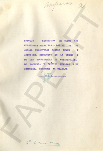 Estudio sintético de todas las cuestiones relativas a los juicios de amparo promovidos contra leyes y actos del Ejecutivo de la Unión y de las Secretarías de Gobernación, de Hacienda y Crédito Público y de Industria, Comercio y Trabajo.
