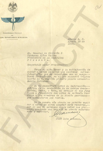 Carta del Gral. José Luis Amezcua, Jefe del Departamento de Aviación, al Gral. PEC notificándole el envío de fotografías sobre el accidente del piloto Emilio Carranza. Memorándum del Gral. Amezcua exponiendo un plan militar tentativo para la eliminación de los escobaristas.