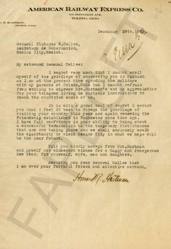 H. Hartman de American Railway Express Co., envía felicitaciones de año nuevo al Gral. PEC y le informa de sus deseos de visitarlo en México.