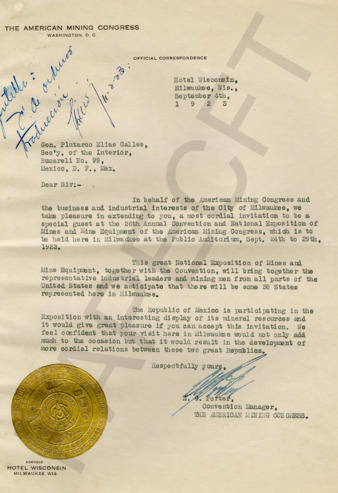 Carta e invitación del Congreso Minero Americano al Gral. PEC ante la 26a. Convención Anual y Exposición Nacional de Minas y Equipo Minero. El Gral. PEC se disculpa por la imposibilidad de su asistencia.
