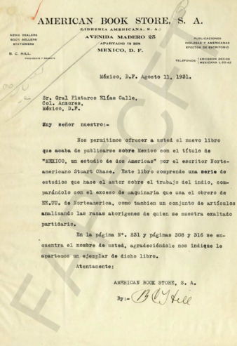 Carta de B. C. Hill al Gral. PEC para ofrecerle el libro de Stuart Chase, titulado MEXICO, UN ESTUDIO DE DOS AMERICAS.