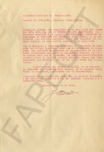 Francisco Alonso suplica al Gral. PEC influya para que sea admitido el niño Raúl Alonso en la Escuela Industrial de Huérfanos.