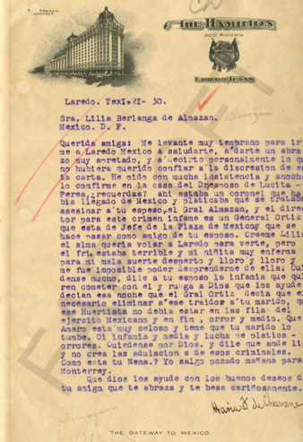 María T. de Chavane escribe a Lilia Almazán, esposa del Gral. Almazán, advirtiéndole de la intriga creada por un Gral. de apellido Ortiz para asesinar al Gral. Juan Andrew Almazán.