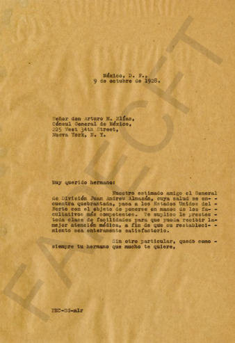 Correspondencia entre el Corl. J. A. Almeida, Gobernador de Chihuahua y el Gral. PEC. Recomendaciones, proyectos económicos y felicitaciones. Carta de M. Mascareñas, Gobernador Interino del estado de Chihuahua a Alberto Mascareñas, Director del Banco de México. Adjunta informe sobre los sucesos políticos en Chihuahua, los días 15 y 16 de abril de 1927, relativos al derrocamiento del Corl. J. A. Almeida. Correspondencia entre Fernando Orozco, Gobernador del estado de Chihuahua y el Gral. PEC. Pide que la nación pague el adeudo que tiene con el estado de Chihuahua por los daños ocasionados con el levantamiento del Corl. Miguel J. Gutiérrez, Jefe de las Guardias Presidenciales. Informa de obras realizadas en el estado de Chihuahua y envía fotografías (véase en Fototeca).