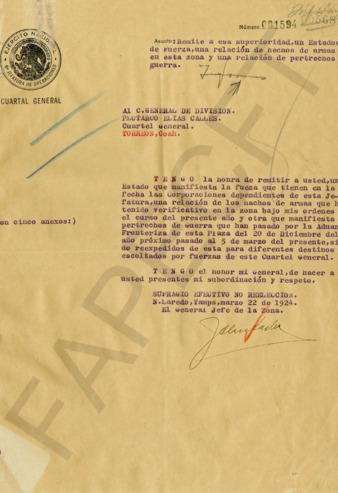 Telegrama del Dr. Leonides Andreu Almazán al Gral. PEC. Le comunica que el grupo de Medrano, Márquez y Galindo pretende apoderarse del Congreso de la Unión para romper la estabilidad. El Dr. Almazán envía una montura al Gral. PEC como obsequio. Comunicación entre el Dr. Almazán y el Gral. PEC, Secretario de Guerra y Marina. El Dr. Almazán le transcribe el mensaje del Secretario de Gobernación, referente a las garantías y facilidades que deben otorgarse con motivo de las elecciones municipales, sin interferencias por parte de las autoridades militares. Denuncia intervención violenta en el proceso electoral, por parte de fuerzas federales. Contestación del Gral. PEC en la cual reclama al Jefe de Operaciones Militares del Estado. Memorial de la Comisión Permanente del Congreso de Puebla, dirigido al Gral. PEC, en el cual se exponen detalles probatorios de la culpabilidad del Diputado Riva Palacio en el asalto al Dr. Almazán. Telegrama del Dr. Almazán al Gral. PEC, Secretario de Guerra y Marina, en el cual le informa de la existencia de grupos rebeldes en una región próxima a Veracruz, Ver. Carta del Lic. Miguel Giordani al Gral. PEC, Secretario de Guerra y Marina. Demanda en contra del Dr. Almazán por retención de salario y efectivo del Sr. Jorge Plufes, piloto aviador, que trabajó en la propaganda del Dr. Almazán. Telegrama de los vecinos de Tlapanala Matamoros, Pue. al Gral. PEC. Denuncian el rompimiento del pacto de garantías otorgadas por el gobierno del Estado a la Comisión de vecinos del lugar. Carta del Secretario General de la Alianza de Partidos Revolucionarios Independientes de Puebla, adheridos al Partido Nacional Revolucionario, al Gral. PEC. Protestan contra la imposición que pretende el Dr. Almazán del Dip. Avila Parra como Presidente Municipal de la ciudad de Puebla. El Dr.Almazán informa al Gral. PEC, Secretario de Guerra y Marina, de los disturbios causados por las manifestaciones públicas de fanáticos católicos que buscan reformar la ley reglamentaria del Artículo 130 Constitucional; solicita auxilio. Telegramas del Dr. Almazán al Gral. PEC, Secretario de Guerra y Marina. Le transcribe mensajes de ciudadanos que protestan ante las intentonas reeleccionistas de los Diputados federales Bautista, Chávez y otros. Transcribe reclamación de la Confederación de Orizaba para que cesen hostilidades del jefe militar en contra de trabajadores del Ingenio Tilapa. Telegramas de los miembros electos de ayuntamientos al Gral. PEC, Secretario de Guerra y Marina. Envían mensaje de apoyo para el Dr. Almazán y notifican su triunfo electoral. Telegrama del Dr. Leonides Almazán al Gral. PEC. Solicita audiencia con el Ministro Pani para hablar sobre la angustiosa situación económica del estado. Transcribe la solicitud de la Cámara Nacional de Comercio e Industria de Puebla para modificar el decreto de bebidas alcohólicas. Telegrama del Dr. Almazán al Gral. PEC. Transcribe mensaje enviado a Pérez Treviño, Presidente del Comité Ejecutivo del Partido Nacional Revolucionario, en el cual le informa de los ataques en su contra por parte del Dip. Bernardo Chávez. Telegrama del Dr. Almazán al Gral. PEC. Denuncia asalto del Mayor Mantecón del 51o. Regimiento. Mensaje del telefonema del Gobernador de Puebla, Dr. Almazán. Plantea al Gral. PEC no dar reconocimiento a Paz Faz Riza, candidato por el Distrito de Huauchinango, por ser un elemento delahuertista. Cartas del Dr. Almazán al Gral. PEC. Informa sobre sus estudios como cirujano; pregunta por la salud del Gral. PEC. Pide opinión respecto a su postulación como Senador. Informa sobre sus actividades en las legaciones de México.