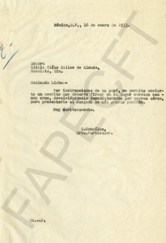 Correspondencia entre Alicia Elías Calles de Almada y su padre, el Gral. PEC. Abundan saludos, envío de objetos, de regalos y artículos diversos. Asuntos exclusivamente familiares.