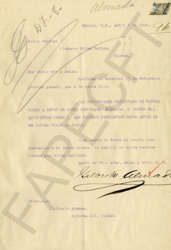Cartas de Gilberto Almada al Gral. PEC en las que pide se le pague el adeudo de $4,500.00, pendiente desde el último viaje al norte.