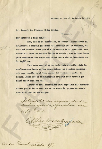 El Lic. Alberto M. González felicita al Gral. PEC con motivo de su onomástico; lo felicita por el recibimiento de que fue objeto en Alemania como Presidente electo de México, por sus declaraciones y por el triunfo sobre el Rebelión escobarista (México : 1929). El Lic. Alberto M. González comenta con el Gral. PEC el asunto relativo al desafuero de los diputados valenzuelistas; lo felicita por su restablecimiento. Carta del Lic. A. M. González, del Departamento Consultivo de Gobernación al Gral. PEC, lamentando que este último deje su cargo como Secretario de Guerra y Marina; solicita audiencia. El Lic. Alberto M. González, Jefe del Departamento de la Prevención Social de la Secretaría de Gobernación, pide al Gral. PEC que se mantenga el presupuesto del Tribunal de Menores y del Departamento de Prevención Social; solicita audiencia; pide informes relativos a su estado de salud y envía un informe de labores desarrolladas por el Departamento de Prevención Social durante el año de 1933.