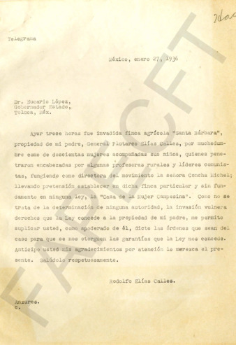 Carta de Soledad González a Rafael Valdéz, Administrador de la Hacienda Santa Bárbara. Le transmite las disposiciones del Gral. PEC, Presidente de la República, para que se le facilite agua suficiente para regar sus tierras a Luis N. Morones, Secretario de Industria, Comercio y Trabajo.