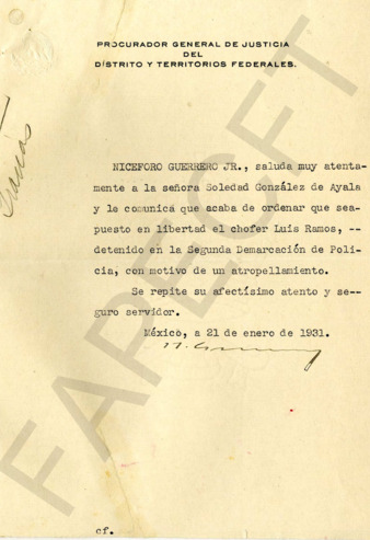Correspondencia entre Nicéforo Guerrero Jr. Procurador General de Justicia del Distrito y Territorios Federales y Soledad González. Notifica que ha sido puesto en libertad el chofer Luis Ramos.