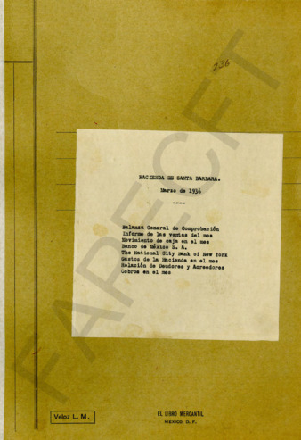 Balances generales, informes de ventas, relaciones de deudores y acreedores de la Hacienda Santa Bárbara. Marzo 1936.