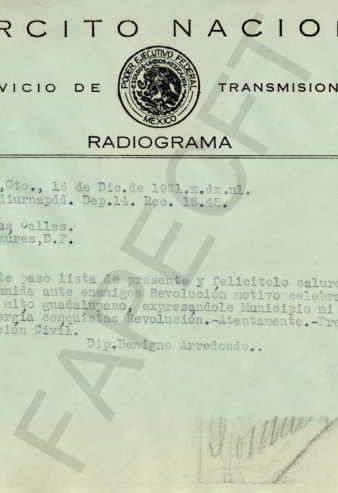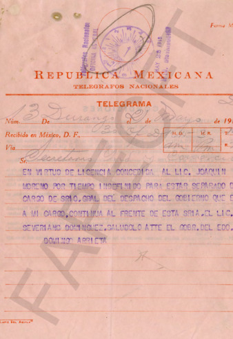 Telegramas entre el Ing. Rafael Arredondo Riofrío y el Gral. PEC sobre una exposición de productos agrícolas y ganaderos en los Tuxtlas.