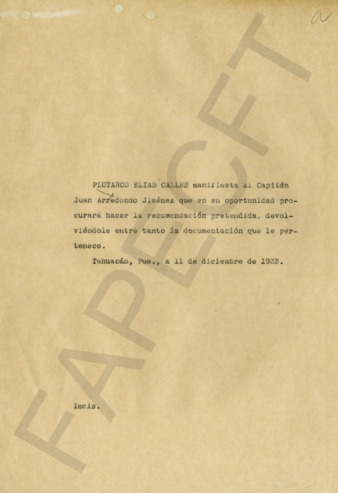 Notificación de una recomendación del Gral. PEC a Juan Arredondo Jiménez.
