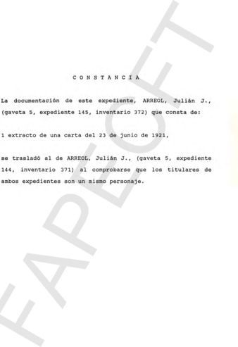La documentación de este expediente se trasladó al de ARREOL, Julián J., gaveta 5, expediente 144, inventario 371.