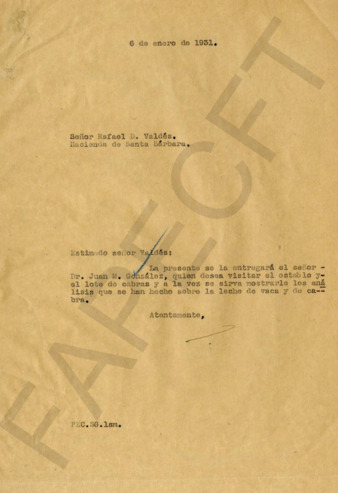 Carta del Gral. PEC a Rafael D. Valdés, encargado de la Hacienda de Santa Bárbara, para que permita al Dr. Juan M. González visitar el establo. Cartas del Dr. Juan M. González a Soledad González, secretaria particular del Gral. PEC, relativas a cobro de honorarios por servicios médicos prestados a los hijos del Gral. PEC; pide una carta de recomendación para poder visitar hospitales de niños en Estados Unidos; manifiesta su adhesión al Gral. PEC por sus declaraciones y lamenta el vacío que dejará a la nación con motivo de su retiro.