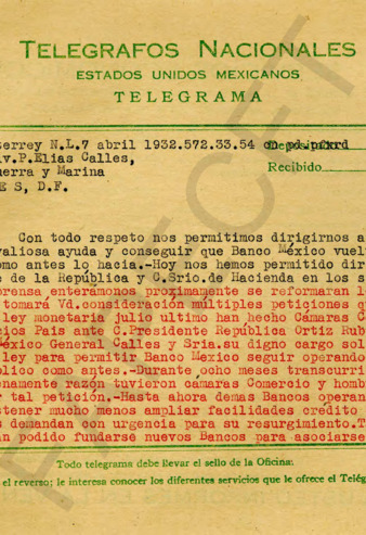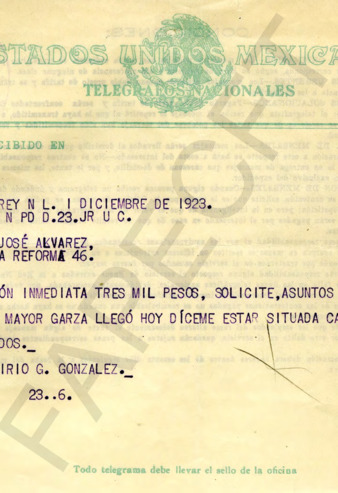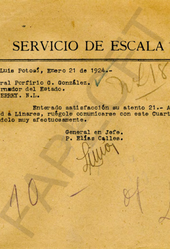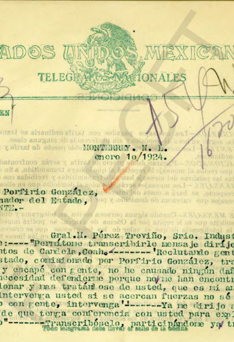 Correspondencia entre el Gral. PEC y Porfirio González, relativa a asuntos militares, partes, informes durante la rebelión delahuertista. Carta anónima dirigida al Gral. PEC, denunciando los planes de Porfirio González de organizar un cuartelazo. Telegrama de Porfirio González, Gobernador de Nuevo León, participando que han terminado los conflictos motivados por las elecciones a poderes generales del estado; le pide interponga su influencia para que terminen las hostilidades a este gobierno en la Suprema Corte. Correspondencia de Porfirio González al Gral. PEC, referente al cuerpo fiscal que se organizó en Nuevo León. P. González, Gobernador de Nuevo León, transcribe al Gral. PEC un telegrama del Presidente Álvaro Obregón referente al levantamiento de Gral. Dávila en Sabinas, Coah. El Gobernador de Nuevo León, P. González informa al Gral. PEC que se han solucionado las dificultades existentes entre industriales y obreros de Monterrey. Oficio en el que Porfirio González, Gobernador constitucional de Nuevo León, nombra al Mayor Longinos R. Garza, Jefe de su Estado Mayor.