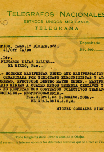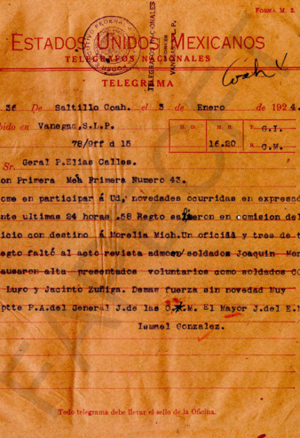 Carta de P. G. González al Gral. PEC, Secretario de Gobernación, informando sobre la mala situación en el servicio de Migración de Nogales, Son; le pide ayuda. Porfirio González notifica al Gral. PEC que varios partidos políticos le ofrecen apoyo para lanzarse como candidato a la gubernatura de Nuevo León y solicita su ayuda. Carta del Sr. Cantú al Gral. PEC, declarando que Porfirio González no debe lanzar su candidatura a Gobernador de Nuevo León hasta que demuestre que no asesinó al alcalde de China, N.L. Telegrama de Porfirio González al Gral. PEC, notificando su triunfo en la contienda electoral para Gobernador de Nuevo León. Porifirio González recomienda ante el Gral. PEC al Gral. José María Rodríguez y a J. Cosme Anaya. El oficial Amílcar Zentella, miembro del Comité Pro Calles, envía propaganda a Porfirio González para que la reparta. Porfirio González informa al Gral. PEC, candidato a la Presidencia, sobre las acciones emprendidas en el estado de Nuevo León en pro de su campaña presidencial; pide se ordene al Gral. López Zuazua que subordine sus esfuerzos a los suyos. Porfirio González comunica al Gral. PEC, candidato a la Presidencia, sus acciones como Delegado General de la Candidatura Pro Calles en el estado de Nuevo León. Memorándum que dirige Porfirio González al Gral. PEC, informando que ha unificado la opinión pública en favor de su candidatura presidencial.