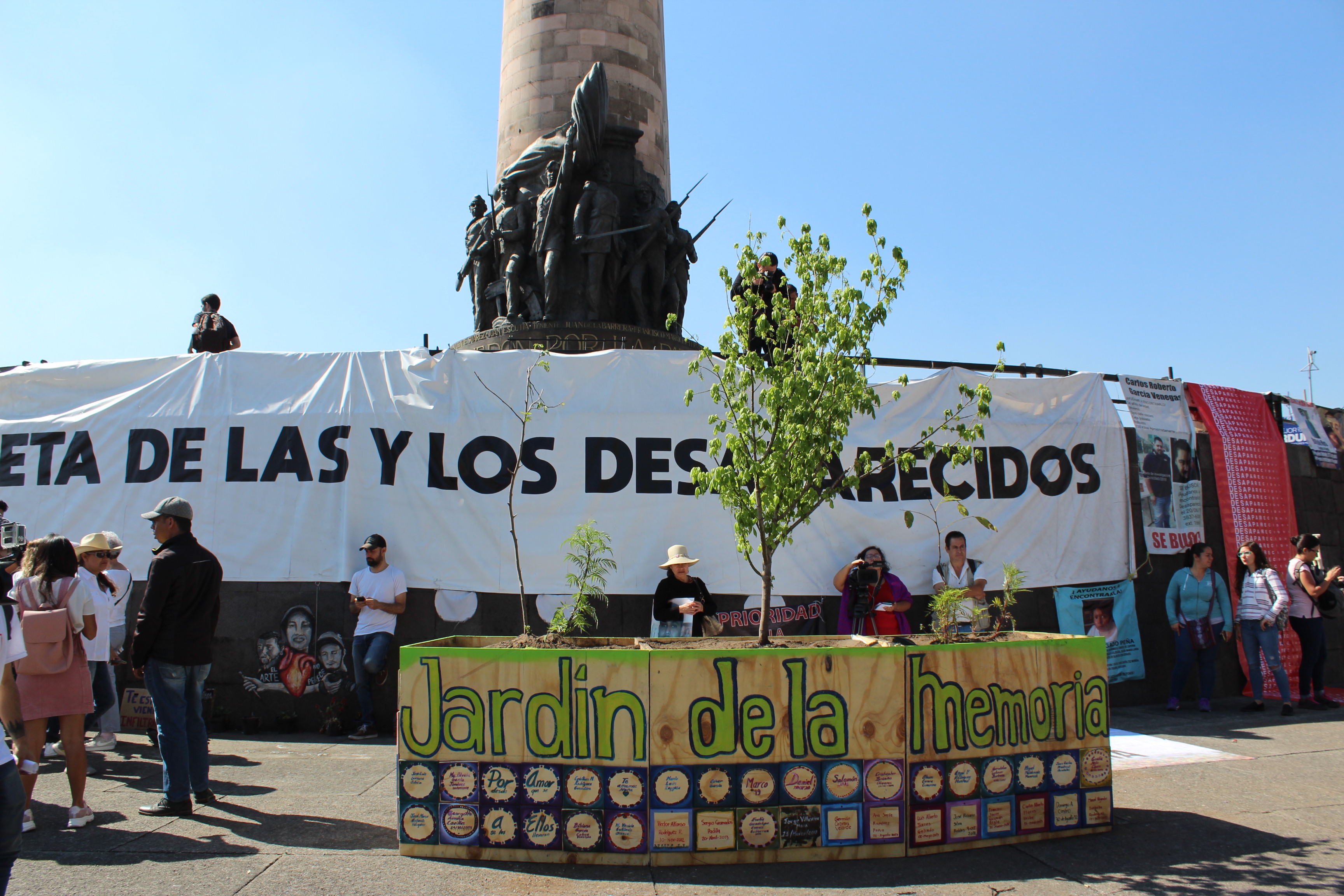 Fotografía de la instalación en memoria de la desaparición forzada de Marco, Salomón y Daniel, estudiantes de la Universidad de Medios Audiovisuales (CAAV) en Guadalajara. A un año del evento familiares, amigos e integrantes del Colectivo de Acción Artística se manifestaron en la Glorieta de las y los desaparecidos donde colocaron El Jardín de la Memoria.