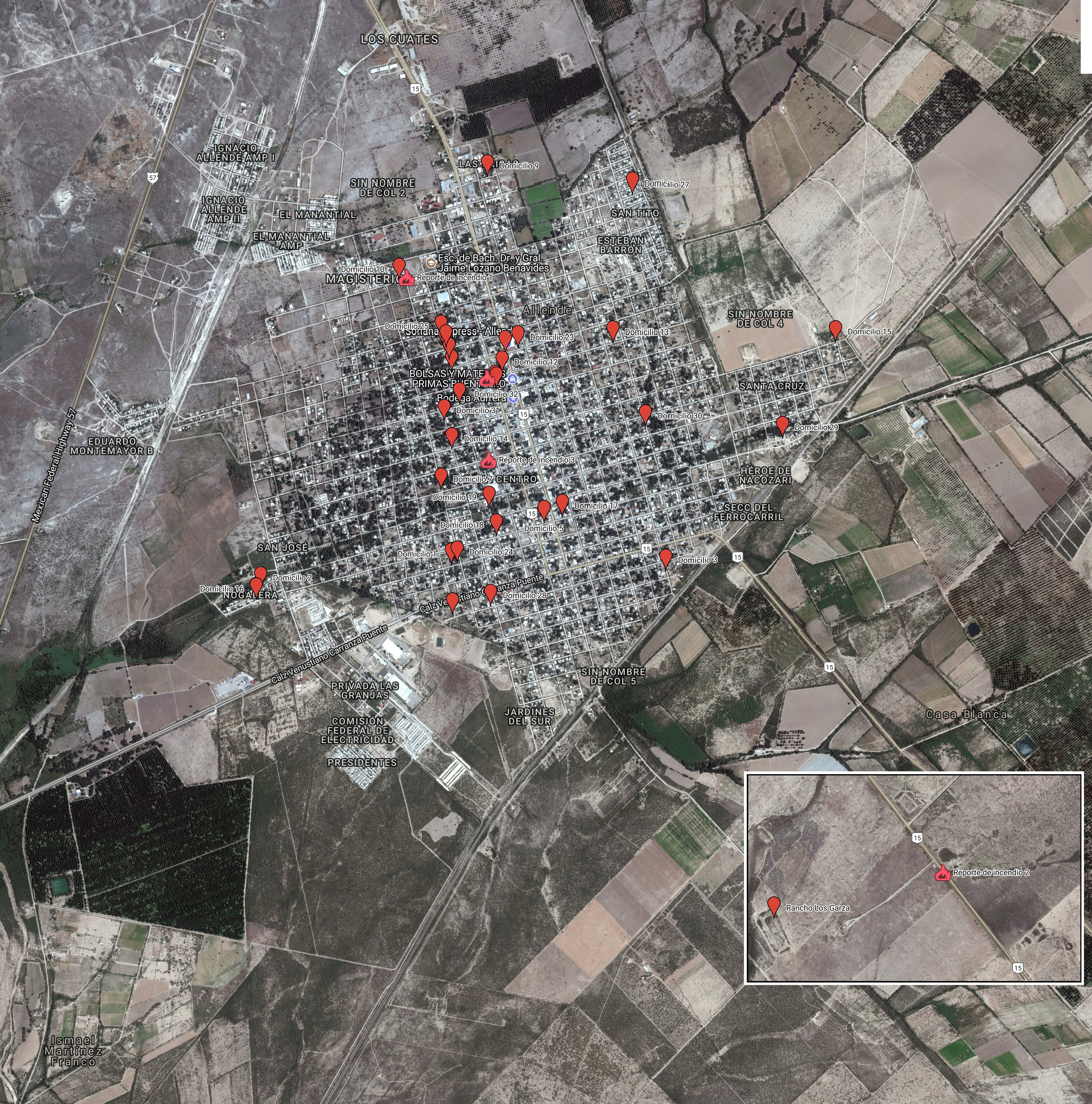 Mapa de vista aérea de la ubicación de las llamadas de reporte de incendio durante 'La Masacre de Allende' en 2011.