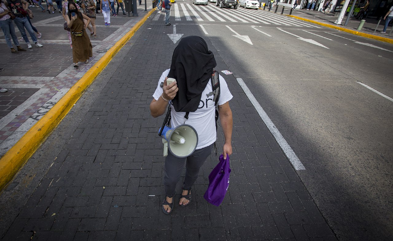 Fotografía de un sobreviviente al llamado halconazo tapatío que salió encapuchado a recorrer las calles de Guadalajara el 5 de junio de 2021 para realizar un performance que representara el temor y la incertidumbre que vivió mientras estuvo privado de su libertad.