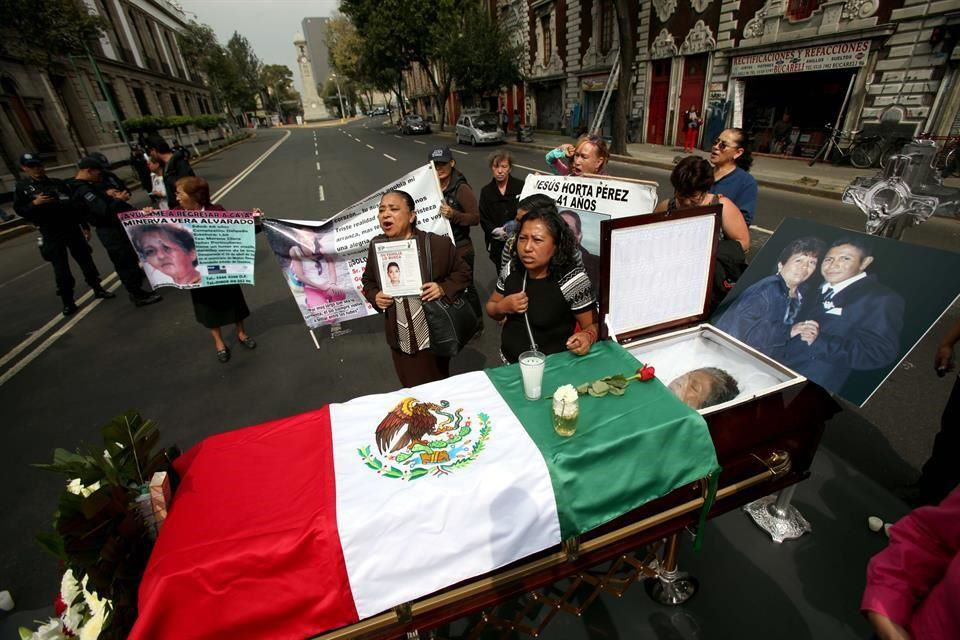 En la imagen, el féretro de Margarita Santizo afuera de la Secretaría de Gobernación. El acto de protesta se realizó para cumplir la última voluntad de la madre de Esteban Morales Santizo, policía federal, desaparecido en Lázaro Cárdenas, Michoacán, el 3 de diciembre de 2009.