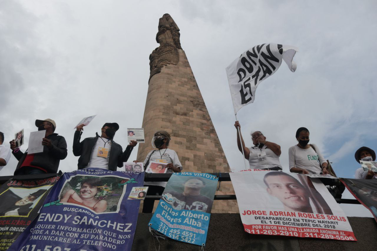 Fotografía de familiares de desaparecidos pidiendo apoyo para localizar a las víctimas en la Glorieta de las y los desaparecidos de Jalisco. La marcha se realizó en el marco de la Búsqueda Nacional de Vida en la entidad que se llevó a cabo del 5 al 18 de julio de 2021.