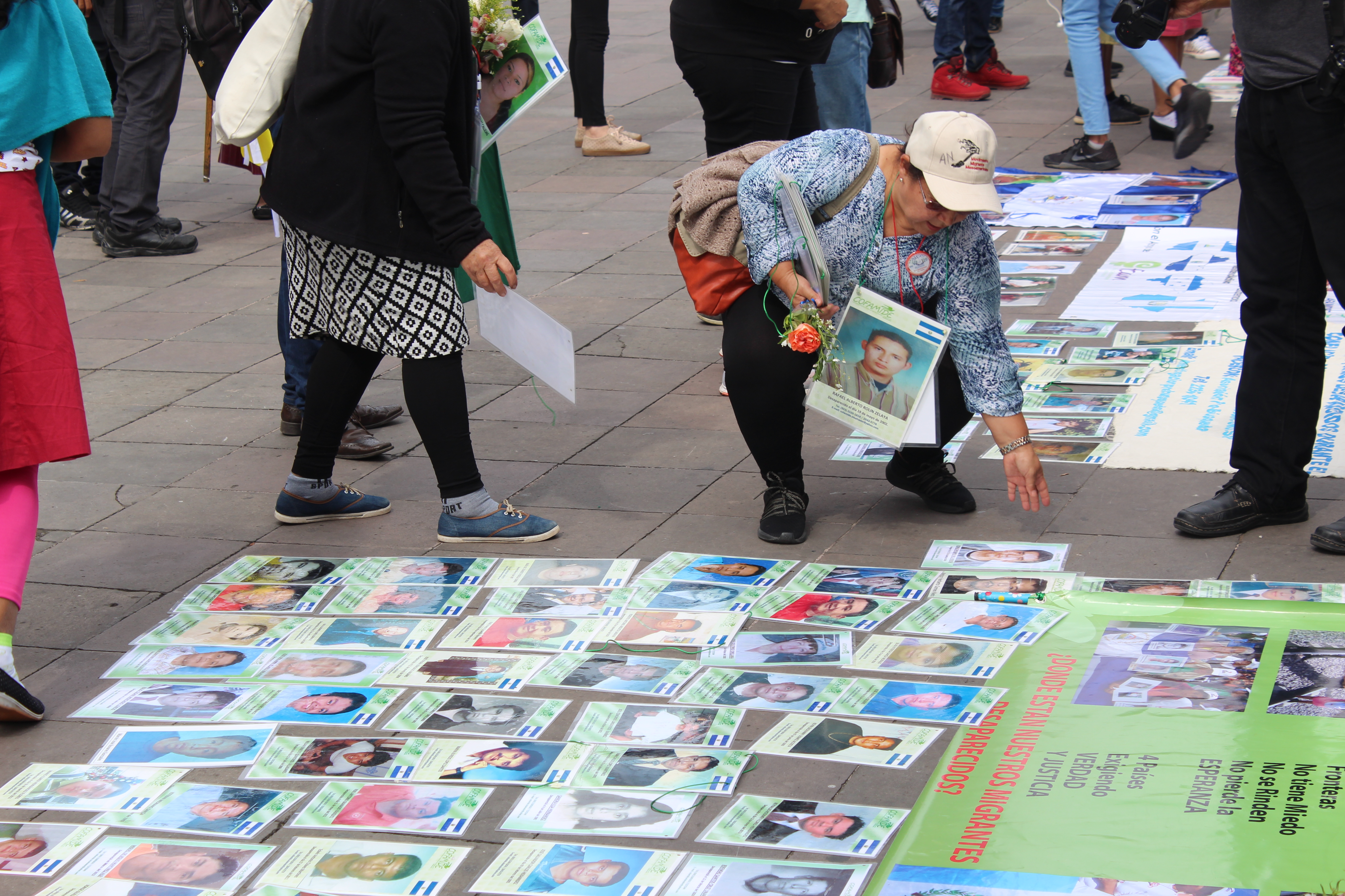 Fotografía del paso de las madres centroamericanas por Aguascalientes y Morelia en donde exigieron a las Comisiones de Búsqueda incluir en sus acciones y discursos a los migrantes desaparecidos. En la imagen integrantes de la XV Caravana buscan a sus seres queridos.